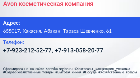 Avon, косметическая компания по адресу 655017, Хакасия, Абакан, Тараса Шевченко, 61 в дальнейшем Организация, размещена в следующих категориях: