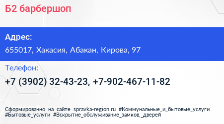 Б2, барбершоп по адресу 655017, Хакасия, Абакан, Кирова, 97 в дальнейшем Организация, размещена в следующих категориях: