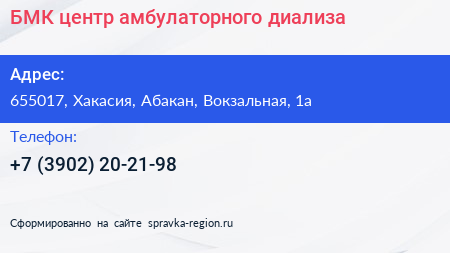 БМК, центр амбулаторного диализа по адресу 655017, Хакасия, Абакан, Вокзальная, 1а в дальнейшем Организация, размещена в следующих категориях: