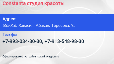 Constanta, студия красоты по адресу 655016, Хакасия, Абакан, Торосова, 9а в дальнейшем Организация, размещена в следующих категориях:
