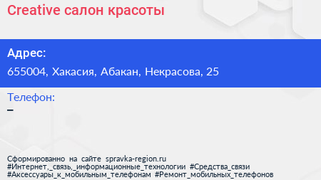 Creative, салон красоты по адресу 655004, Хакасия, Абакан, Некрасова, 25 в дальнейшем Организация, размещена в следующих категориях: