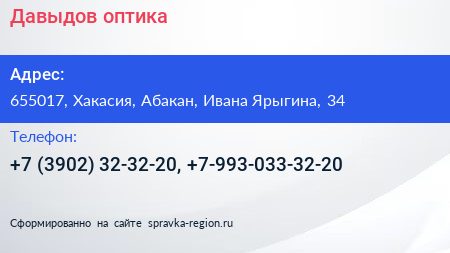 Давыдов, оптика по адресу 655017, Хакасия, Абакан, Ивана Ярыгина, 34 в дальнейшем Организация, размещена в следующих категориях: