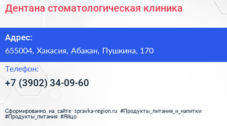 Дентана, стоматологическая клиника по адресу 655004, Хакасия, Абакан, Пушкина, 170 в дальнейшем Организация, размещена в следующих категориях: