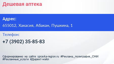 Дешевая аптека по адресу 655012, Хакасия, Абакан, Пушкина, 1 в дальнейшем Организация, размещена в следующих категориях: