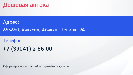Дешевая аптека по адресу 655650, Хакасия, Абакан, Ленина, 94 в дальнейшем Организация, размещена в следующих категориях: