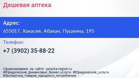 Дешевая аптека по адресу 655017, Хакасия, Абакан, Пушкина, 195 в дальнейшем Организация, размещена в следующих категориях: