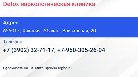 Detox, наркологическая клиника по адресу 655017, Хакасия, Абакан, Вокзальная, 20 в дальнейшем Организация, размещена в следующих категориях: