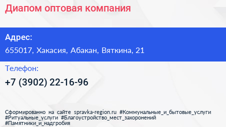 Диапом, оптовая компания по адресу 655017, Хакасия, Абакан, Вяткина, 21 в дальнейшем Организация, размещена в следующих категориях: