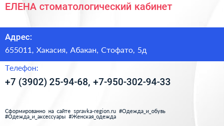 ЕЛЕНА, стоматологический кабинет по адресу 655011, Хакасия, Абакан, Стофато, 5д в дальнейшем Организация, размещена в следующих категориях: