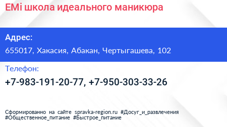 EMi, школа идеального маникюра по адресу 655017, Хакасия, Абакан, Чертыгашева, 102 в дальнейшем Организация, размещена в следующих категориях:
