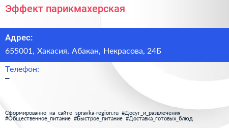 Эффект, парикмахерская по адресу 655001, Хакасия, Абакан, Некрасова, 24Б в дальнейшем Организация, размещена в следующих категориях: