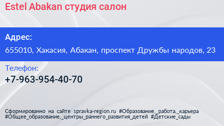 Estel Abakan, студия-салон по адресу 655010, Хакасия, Абакан, проспект Дружбы народов, 23 в дальнейшем Организация, размещена в следующих категориях: