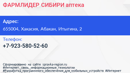 ФАРМЛИДЕР СИБИРИ, аптека по адресу 655004, Хакасия, Абакан, Итыгина, 2 в дальнейшем Организация, размещена в следующих категориях: