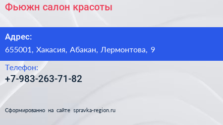 Фьюжн, салон красоты по адресу 655001, Хакасия, Абакан, Лермонтова, 9 в дальнейшем Организация, размещена в следующих категориях:
