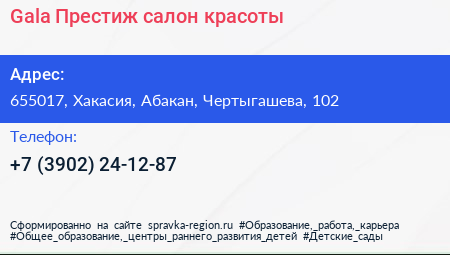 Gala Престиж, салон красоты по адресу 655017, Хакасия, Абакан, Чертыгашева, 102 в дальнейшем Организация, размещена в следующих категориях: