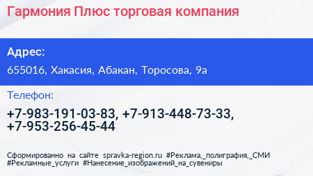 Гармония Плюс, торговая компания по адресу 655016, Хакасия, Абакан, Торосова, 9а в дальнейшем Организация, размещена в следующих категориях: