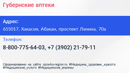 Губернские аптеки по адресу 655017, Хакасия, Абакан, проспект Ленина, 70а в дальнейшем Организация, размещена в следующих категориях: