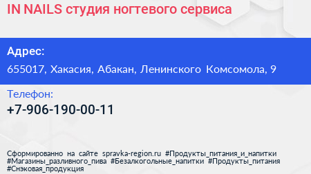 IN NAILS, студия ногтевого сервиса по адресу 655017, Хакасия, Абакан, Ленинского Комсомола, 9 в дальнейшем Организация, размещена в следующих категориях: