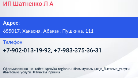 ИП Шатненко Л.А. по адресу 655017, Хакасия, Абакан, Пушкина, 111 в дальнейшем Организация, размещена в следующих категориях: