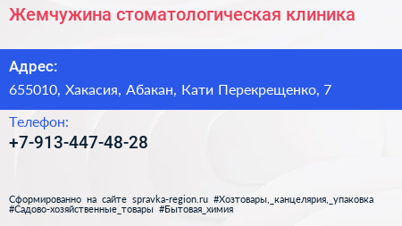 Жемчужина, стоматологическая клиника по адресу 655010, Хакасия, Абакан, Кати Перекрещенко, 7 в дальнейшем Организация, размещена в следующих категориях: