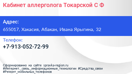 Кабинет аллерголога Токарской С.Ф. по адресу 655017, Хакасия, Абакан, Ивана Ярыгина, 32 в дальнейшем Организация, размещена в следующих категориях: