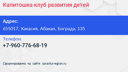 Капитошка, клуб развития детей по адресу 655017, Хакасия, Абакан, Бограда, 135 в дальнейшем Организация, размещена в следующих категориях: