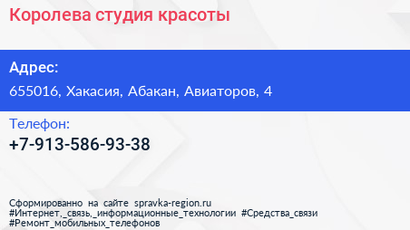 Королева, студия красоты по адресу 655016, Хакасия, Абакан, Авиаторов, 4 в дальнейшем Организация, размещена в следующих категориях: