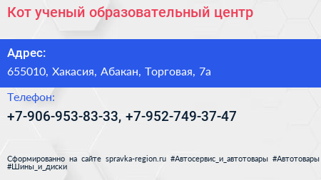 Кот ученый, образовательный центр по адресу 655010, Хакасия, Абакан, Торговая, 7а в дальнейшем Организация, размещена в следующих категориях: