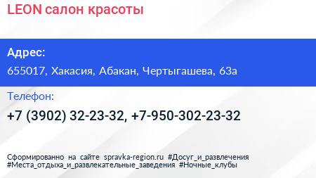 LEON, салон красоты по адресу 655017, Хакасия, Абакан, Чертыгашева, 63а в дальнейшем Организация, размещена в следующих категориях:
