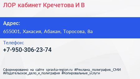ЛОР-кабинет Кречетова И.В по адресу 655001, Хакасия, Абакан, Торосова, 8а в дальнейшем Организация, размещена в следующих категориях:
