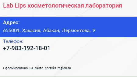 Lab Lips, косметологическая лаборатория по адресу 655001, Хакасия, Абакан, Лермонтова, 9 в дальнейшем Организация, размещена в следующих категориях: