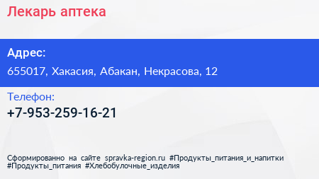 Лекарь, аптека по адресу 655017, Хакасия, Абакан, Некрасова, 12 в дальнейшем Организация, размещена в следующих категориях: