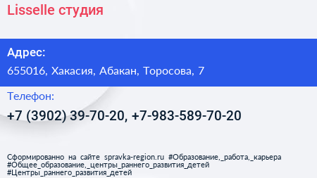 Lisselle, студия по адресу 655016, Хакасия, Абакан, Торосова, 7 в дальнейшем Организация, размещена в следующих категориях: