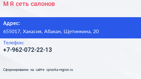 М.R., сеть салонов по адресу 655017, Хакасия, Абакан, Щетинкина, 20 в дальнейшем Организация, размещена в следующих категориях: