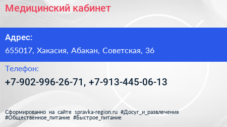 Медицинский кабинет по адресу 655017, Хакасия, Абакан, Советская, 36 в дальнейшем Организация, размещена в следующих категориях: