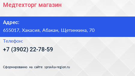 Медтехторг, магазин по адресу 655017, Хакасия, Абакан, Щетинкина, 70 в дальнейшем Организация, размещена в следующих категориях:
