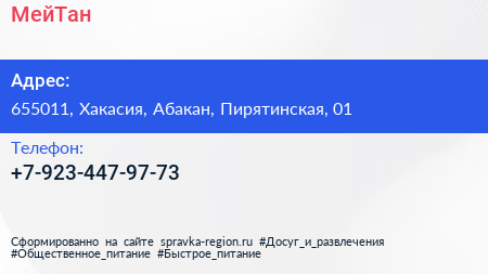 МейТан по адресу 655011, Хакасия, Абакан, Пирятинская, 01 в дальнейшем Организация, размещена в следующих категориях:
