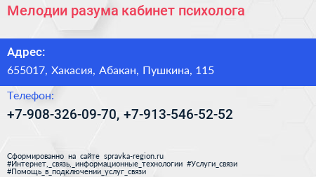 Мелодии разума, кабинет психолога по адресу 655017, Хакасия, Абакан, Пушкина, 115 в дальнейшем Организация, размещена в следующих категориях: