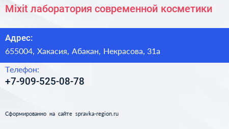 Mixit, лаборатория современной косметики по адресу 655004, Хакасия, Абакан, Некрасова, 31а в дальнейшем Организация, размещена в следующих категориях:
