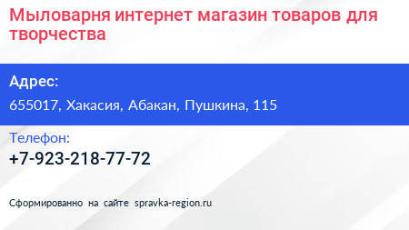 Мыловарня, интернет-магазин товаров для творчества по адресу 655017, Хакасия, Абакан, Пушкина, 115 в дальнейшем Организация, размещена в следующих категориях: