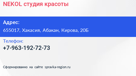 NEKOL, студия красоты по адресу 655017, Хакасия, Абакан, Кирова, 20Б в дальнейшем Организация, размещена в следующих категориях: