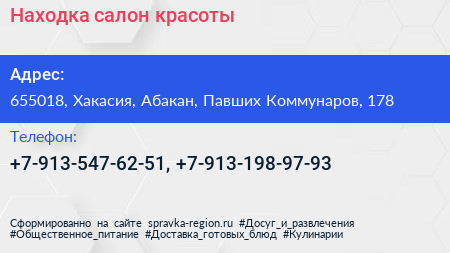 Находка, салон красоты по адресу 655018, Хакасия, Абакан, Павших Коммунаров, 178 в дальнейшем Организация, размещена в следующих категориях: