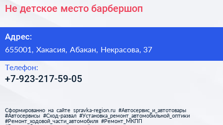 Не детское место, барбершоп по адресу 655001, Хакасия, Абакан, Некрасова, 37 в дальнейшем Организация, размещена в следующих категориях: