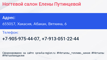 Ногтевой салон Елены Путинцевой по адресу 655017, Хакасия, Абакан, Вяткина, 6 в дальнейшем Организация, размещена в следующих категориях: