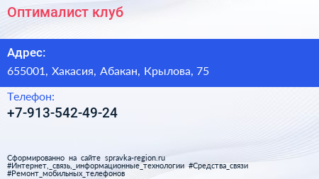 Оптималист, клуб по адресу 655001, Хакасия, Абакан, Крылова, 75 в дальнейшем Организация, размещена в следующих категориях: