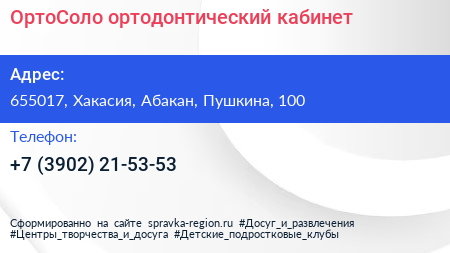 ОртоСоло, ортодонтический кабинет по адресу 655017, Хакасия, Абакан, Пушкина, 100 в дальнейшем Организация, размещена в следующих категориях: