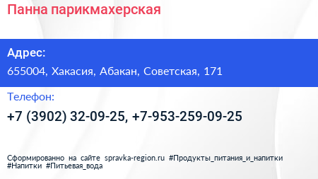 Панна, парикмахерская по адресу 655004, Хакасия, Абакан, Советская, 171 в дальнейшем Организация, размещена в следующих категориях: