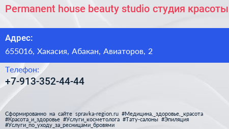 Permanent house beauty studio, студия красоты по адресу 655016, Хакасия, Абакан, Авиаторов, 2 в дальнейшем Организация, размещена в следующих категориях: