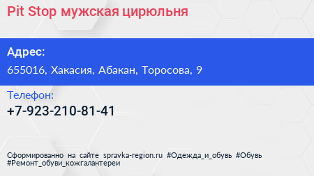 Pit Stop, мужская цирюльня по адресу 655016, Хакасия, Абакан, Торосова, 9 в дальнейшем Организация, размещена в следующих категориях: