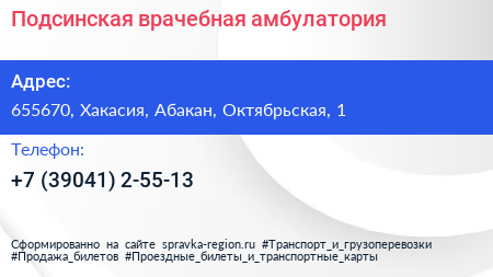 Подсинская врачебная амбулатория по адресу 655670, Хакасия, Абакан, Октябрьская, 1 в дальнейшем Организация, размещена в следующих категориях: